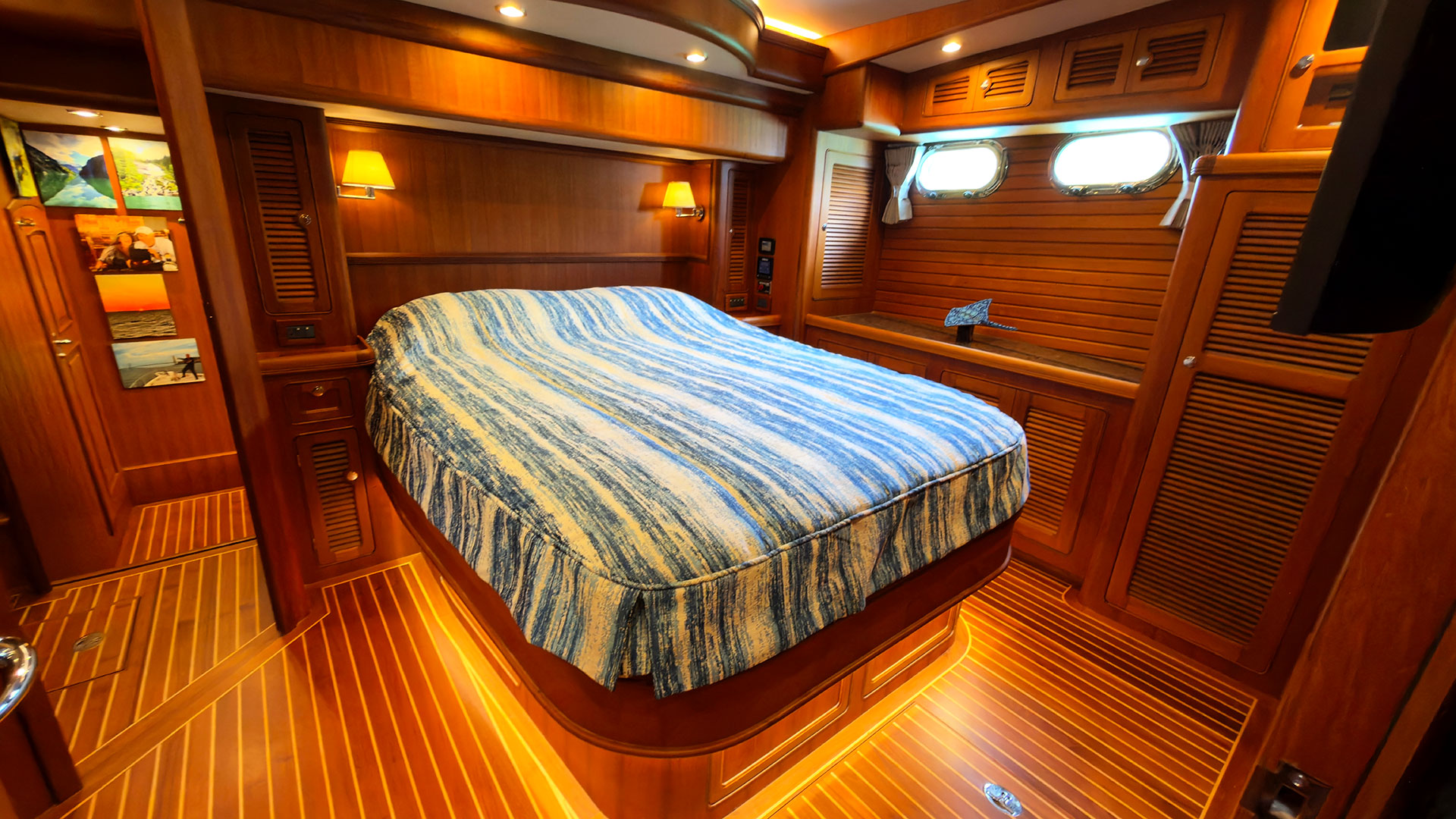 This Selene 56 is the “deep hull” configuration with more headroom in the engine room and the cruisers stern aft which provides a bit more waterline underway and is softens floating at anchor. Her arrangement summary is: three staterooms, two heads, single engine, double walking side decks.
